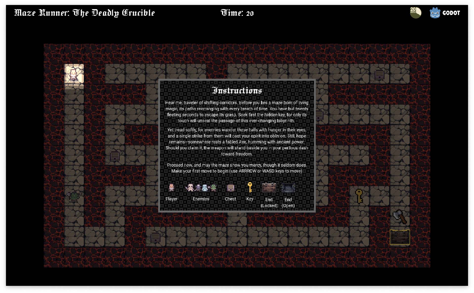 Hear me, traveler of shifting corridors. Before you lies a maze born of living magic, its paths rearranging with every breath of time. You have but twenty fleeting seconds to escape its grasp. Seek first the hidden key, for only its touch will unseal the passage of this ever-changing labyrinth.
